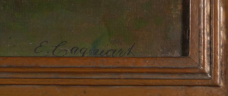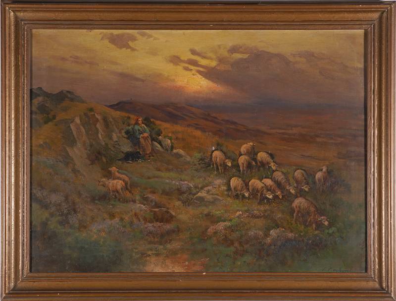 1851 - 1911 Paris. Schäferin mit Herde vor Landschaft im Sonnenuntergang. Öl auf Leinwand. Unten rechts signiert. Größe ca. 52,5 x 72 cm, Rahmen ca. 63 x 82 cm. Teils Farbverlust.