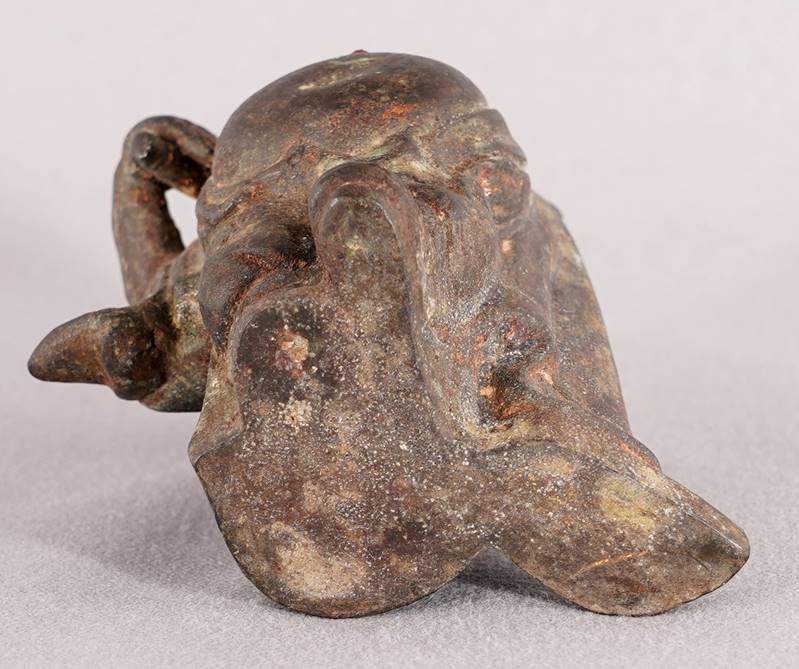 China Qing-Dynastie. Bronze, dunkel patiniert. Figur mit Schweinekopf und Harke über der Schulter. Himmlischer Würdenträger, Begleiter des Mönchs Xuanzang aus dem Roman "Die Reise nach Westen" von Wu Cheng'en (16.Jh.). Größe ca. 8 x 6,5 cm, Höhe ca. 12 cm. Altersbedingter Zustand wie abgebildet.