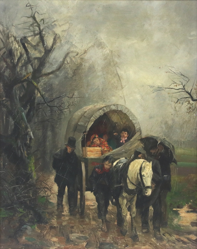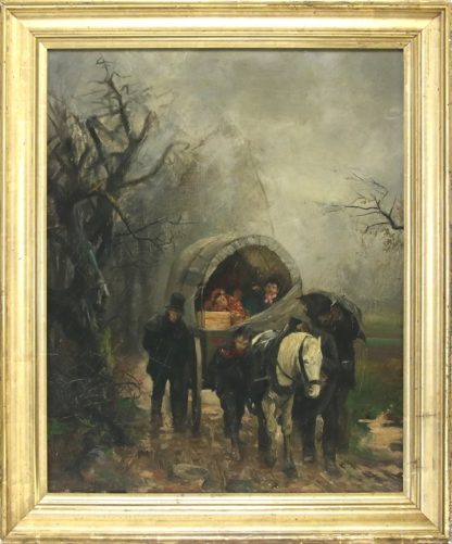 Deutscher Künstler um 1890. Pferdefuhrwerk in winterlicher Landschaft. Öl auf Leinwand. Unten links undeutlich signiert und datiert (18)80. Größe ca. 86 x 55 cm, schöner teils vergoldeter Rahmen ca. 78 x 65 cm.