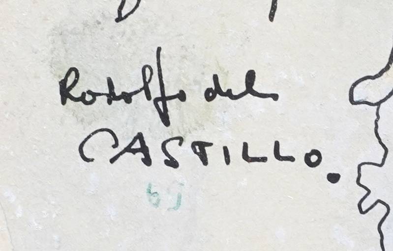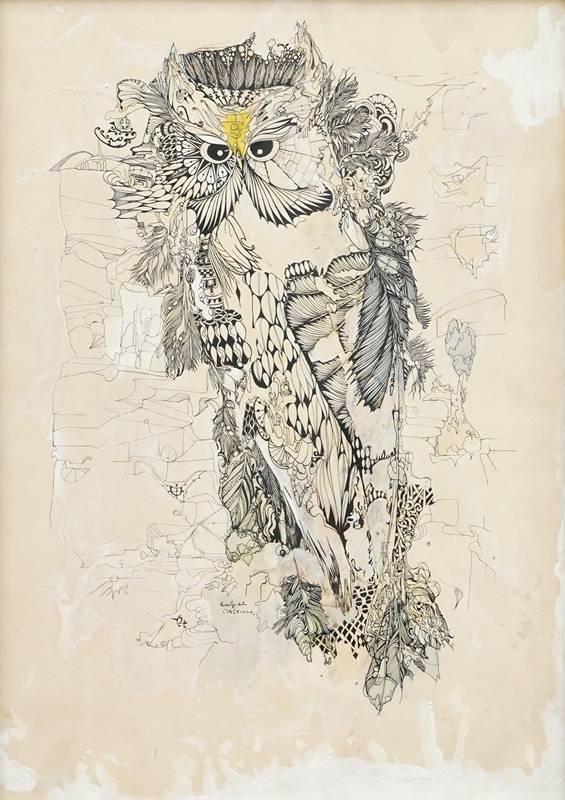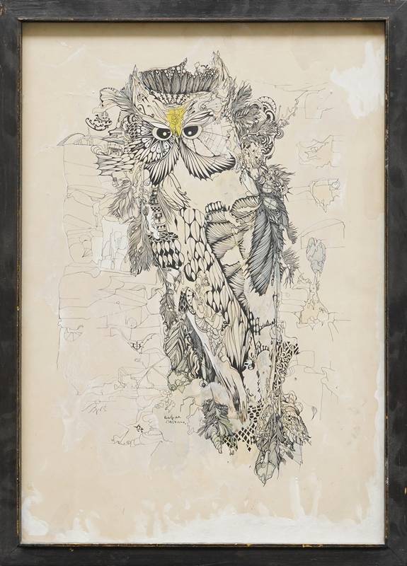 del Castillo, Rodolfo Maria 1933 - 1979 Spanien. Eule. Mischtechnik auf Papier. Unten links signiert, verso mit Sammleretikett, darauf datiert 1969 sowie Provenienz "gekauft vom Künstler". Größe ca. 64 x 45 cm, hinter Glas gerahmt ca. 69 x 50 cm.