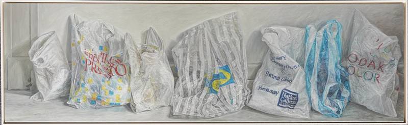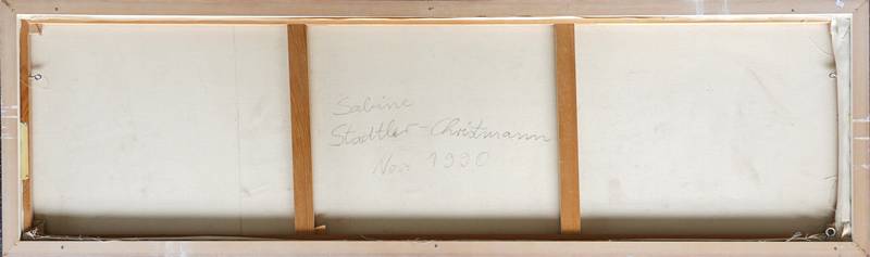 *1960 Offenbach am Main. Tüten weiß. Öl auf Leinwand. Verso signiert und datiert November 1990. Größe ca. 60 x 200 cm, Rahmen ca. 63,5 x 203 cm.