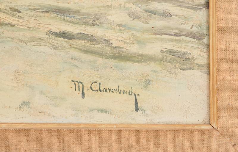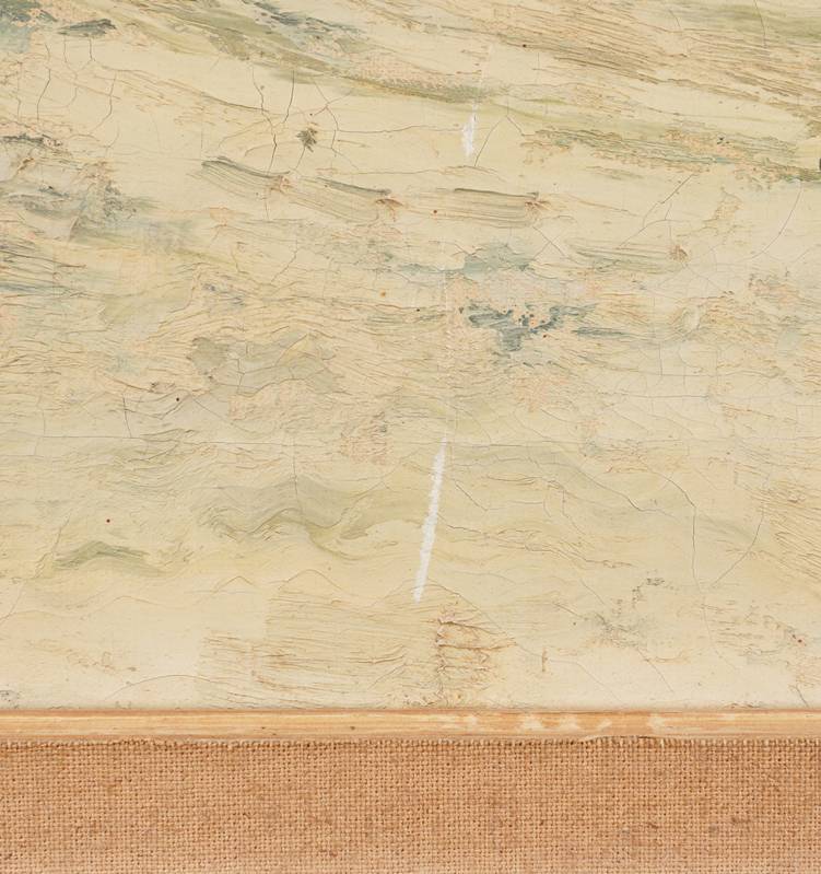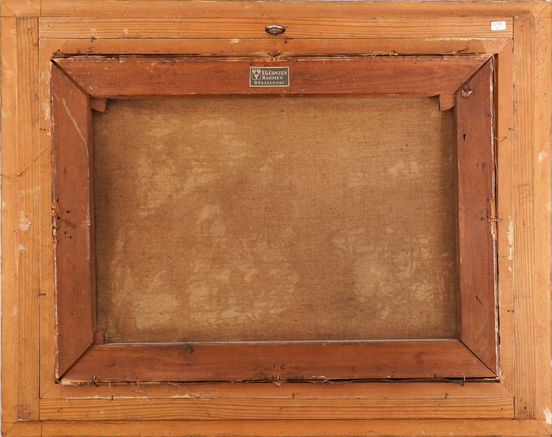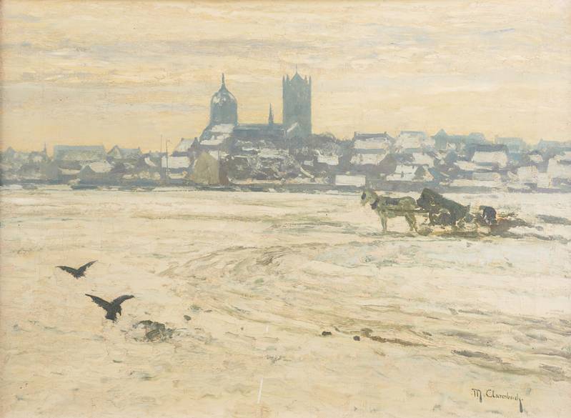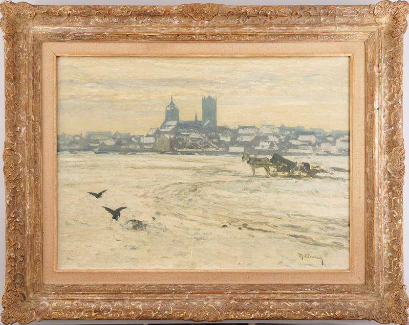 1880 Neuss - 1952 Wittlaer. Ansicht von Neuss in blauem Winterlicht mit Pferdewagen und Krähen im Vordergrund. Öl auf Leinwand. Unten rechts signiert. Größe ca. 38,5 x 53 cm, Rahmen ca. 53 x 67 cm. Teils mit Craquelé, unten mittig mit Kratzer.