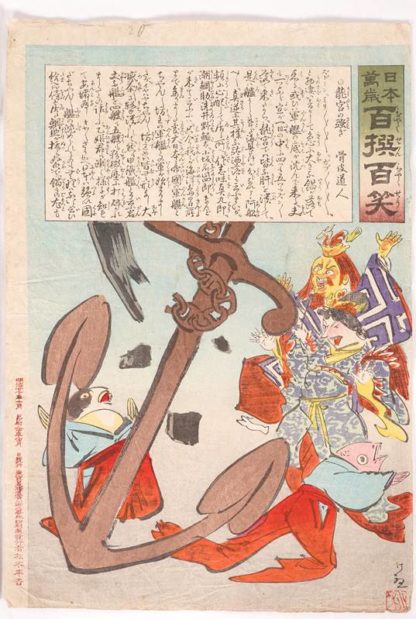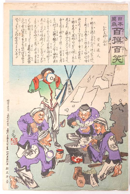 1847 Tokyo - 1915. Drei Holzschnitte aus der Serie: Lang Lebe Japan: 100 Siege, 100 Lacher. Größe ca. 36,5 x 24,5 cm. Teils an den Rändern etwas geknickt, teils faltig. Aus Hegauer Privatsammlung.