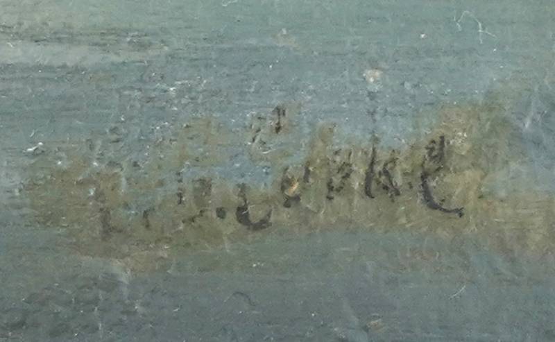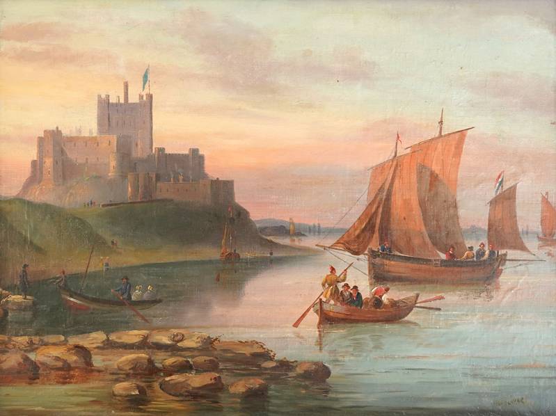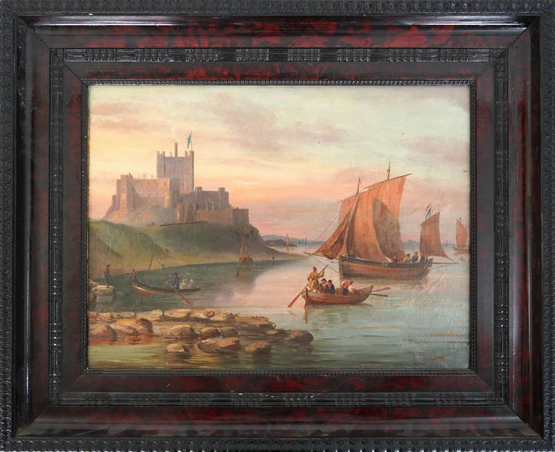 England 19. Jh. Küstenszene mit Segelschiffen. Öl auf Leinwand (doubliert). Unten rechts schwer leserlich bezeichnet. Größe ca. 37 x 50 cm, Rahmen ca. 55 x 68 cm. Mit Craquelé. Restauriert.