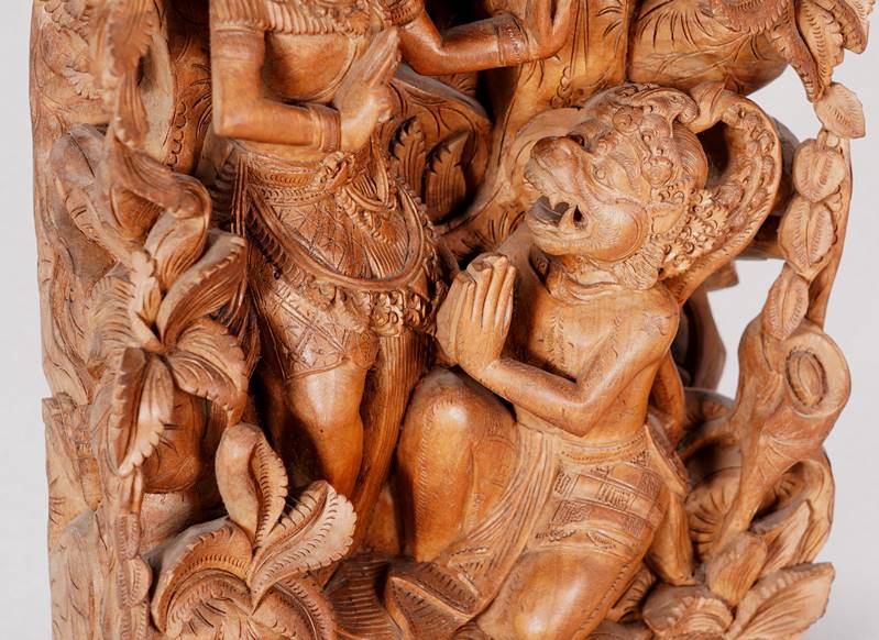Indien 20. Jh. Holz geschnitzt, durchbrochen gearbeitet und ungefasst. Zwei Götter, wohl Rama mit Hanuman, im Wald. Größe ca. 9 x 20 cm, Höhe ca. 38 cm. Teils beschädigt, wohl teils restauriert. Bitte selbst besichtigen.