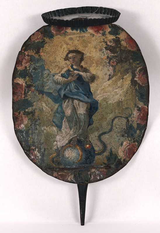 Vier barocke Kerzenhalter Süddeutsch 18. Jh. Vier Kerzenhalter in Form von Blakern zur Wandbefestigung bzw. zum Aufstecken auf einen Altar oder als Vortrageleuchter. Jeweils Metall mit reicher polychromer Bemalung. Maria Immaculata, Erzengel Michael mit der Seelenwaage, heilige Familie und Gottvater mit Christus. Breite ca. 15 cm, Höhe ca. 25 cm. Zustand wie abgebildet.
