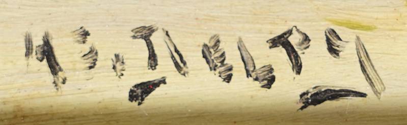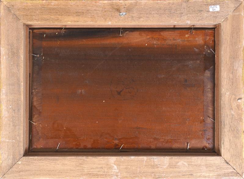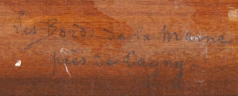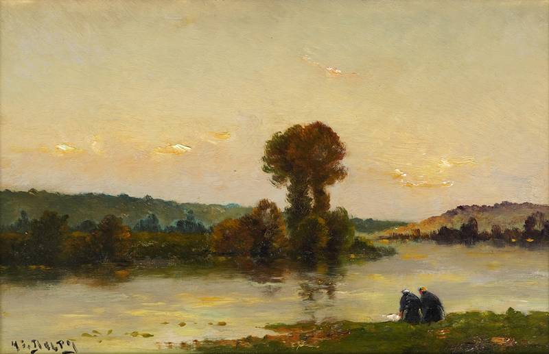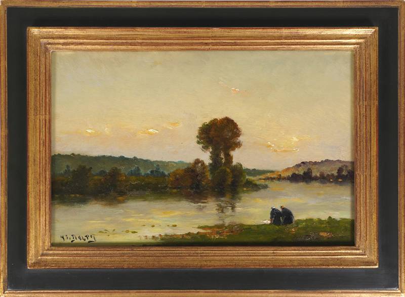 Delpy, Jaques Henri 1877 Bois-le-Roi - 1957 Paris. "Le Bord de la Marne près de Cagny". Atmosphärische Uferlandschaft mit zwei Waschfrauen. Öl auf Holz. Unten links signiert, verso betitelt. Größe ca. 22 x33 cm, Rahmen ca. 32 x 43 cm.