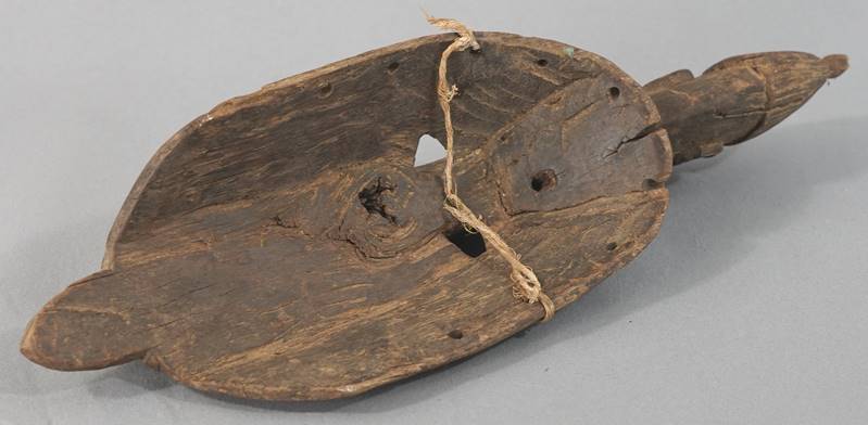 Mali, Dogon. Holz, geschnitzt. Größe ca. 15 x 12 cm, Höhe ca. 47 cm, Gewicht ca. 910 Gramm. Mit Bohrungslöchern entlang des Randes. Teils bestoßen, teils mit Rissen. Das Objekt stammt aus der süddeutschen Privatsammlung Dr. Hartmut Brie.