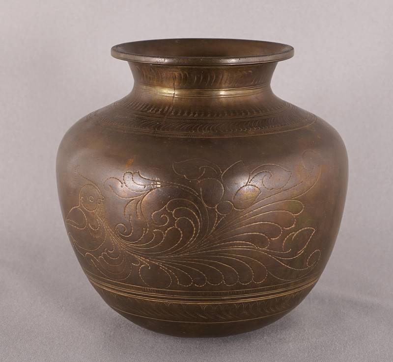 Lota Indien wohl 19. Jh. Messing. Bauchiges Gefäß mit ziselierter Wandung. Durchmesser ca. 18 cm, Höhe ca. 18 cm. Gewicht ca. 1,2 kg. Zustand wie abgebildet.