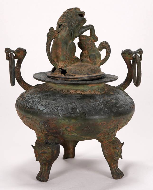 Weihrauchbrenner China Qing Dynastie. Auf drei Füßen mit Grotesken, mit zwei Handhaben in Form von Drachen, Deckel mit Pho Hund mit Jungem. Wandung reliefiert mit Drachen und archaischen Sonnenrad-Darstellungen. Durchmesser ca. 20 cm, Höhe ca. 28 cm. Gewicht ca. 2,76 kg. Starke Patina, Deckel wackelt, Deckel teils beschädigt, teils gerissen.