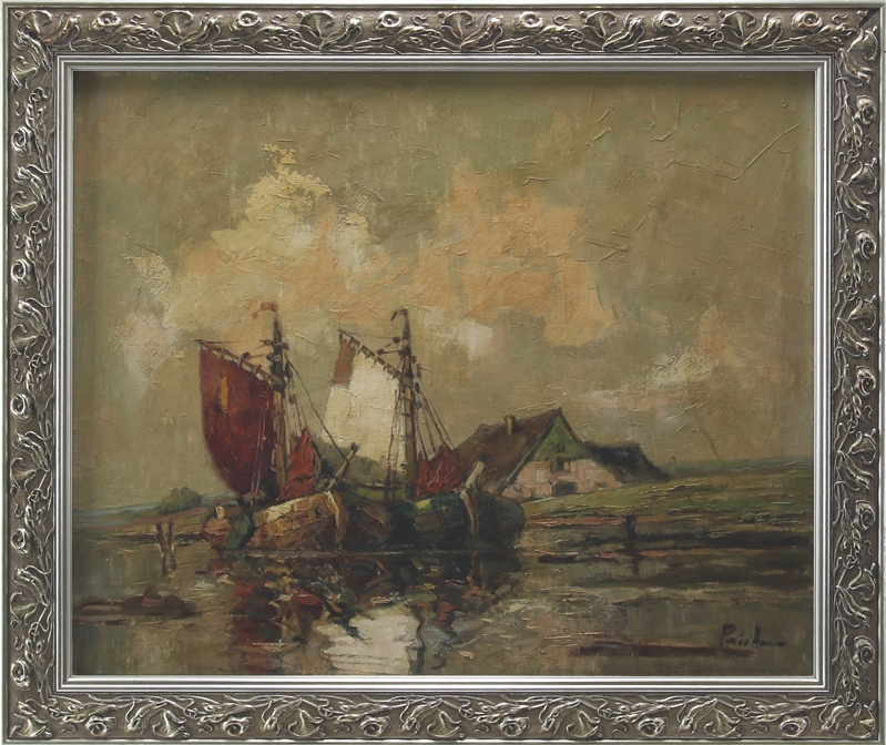 Wohl Worpsweder Schule um 1900. Zeesenboote auf dem Bodden mit Bauernhaus im Hintergrund. Öl auf Leinwand. Unten rechts signiert. Größe ca. 50 x 60 cm, Rahmen ca. 60 x 70 cm.
