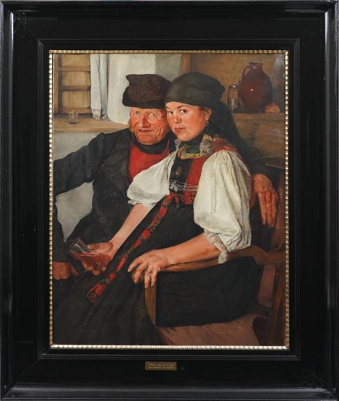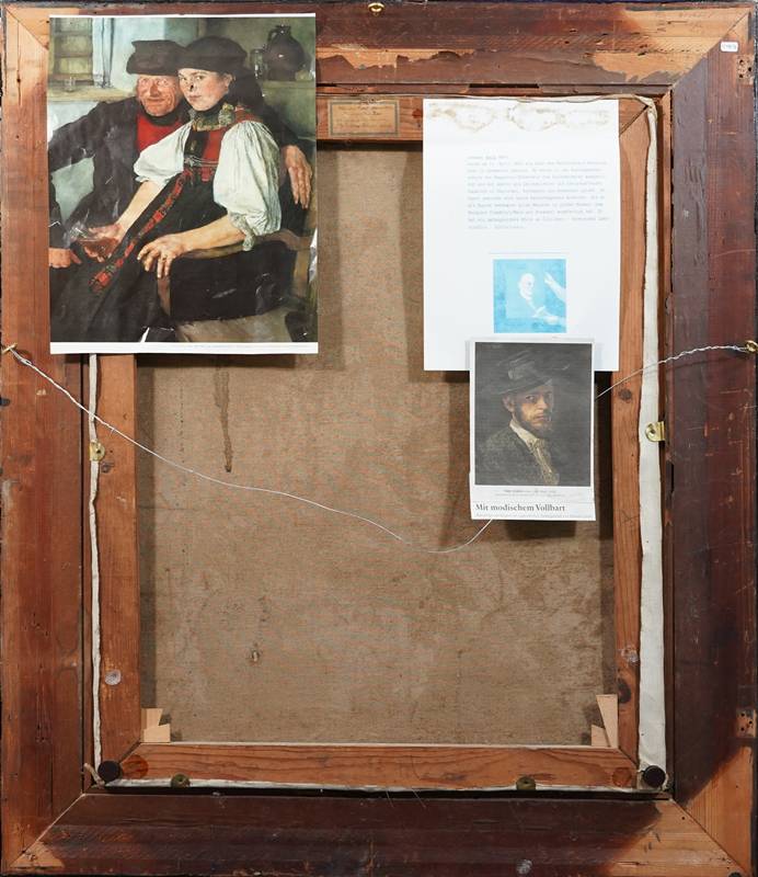 Exel, Johann Karl 1866 Darmstadt - ?. Kopie nach Wilhelm Leibl (1844-1900) "Das ungleiche Paar". Öl auf Leinwand. Größe ca. 76 x 61 cm, Rahmen ca. 100 x 85 cm. Leinwand teils leicht beschädigt.