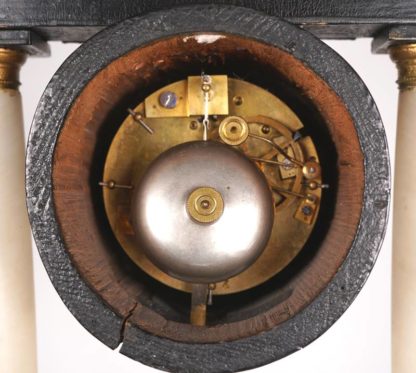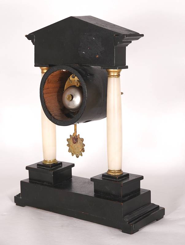 Frankreich 19. Jh. Klassizistischer Aufbau mit ebonisiertem Holzsockel und Giebel, getragen von zwei schlanken Alabastersäulen. Dazwischen die Uhrentrommel. Emailliertes Ziffernblatt in Messingring hinter Glas mit römischen Stundenzahlen. Rundes Messingplatinenwerk mit Pendel an Fadenaufhängung und Schlüsselaufzug. Schlag zur vollen und halben Stunde auf Glocke. Auf der Platine Herstellermarke Japy Freres et Ci sowie Nummerierung 1359. Größe ca. 27 x 10 cm, Höhe ca. 37 cm. Läuft an, Schlag löst aus. Holz teils berieben, hintere Abdeckung fehlt. Schlüssel anbei.