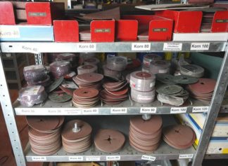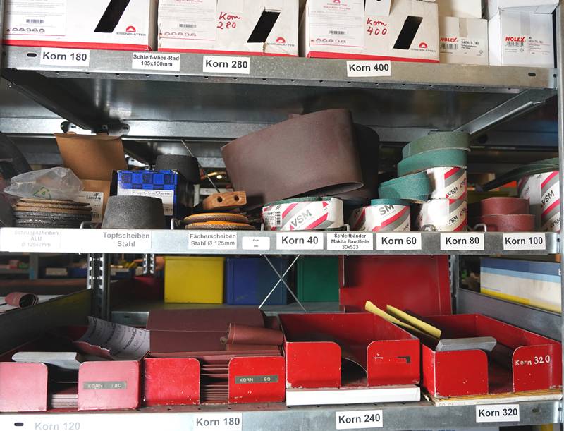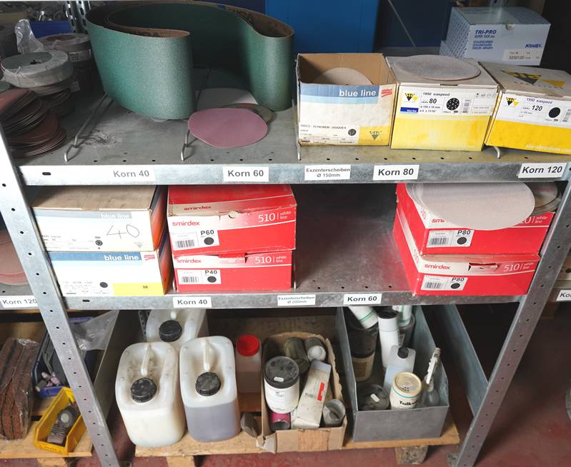 Regalinhalt einteilig mit diversen Schleifmaterialien. Trennscheiben etc.