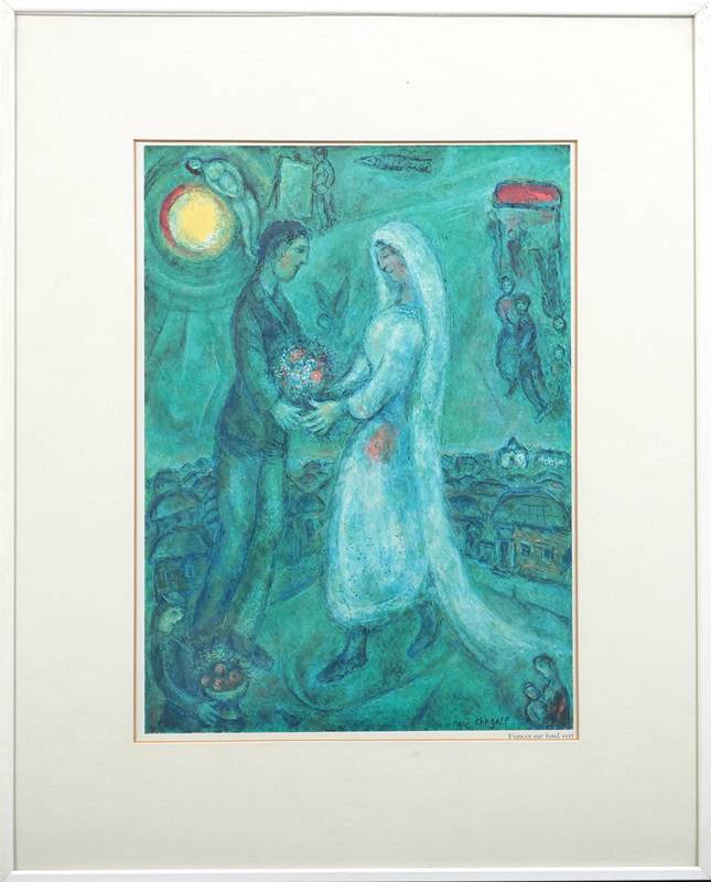 Chagall, Marc 1887 Witebsk - 1985 Saint-Paul-de-Vence, nach. Fiancés sur fond vert, 1979. Offsetdruck. Hinter Passepartout und Glas gerahmt. Bildgröße ca. 34 x 24,5 cm, Rahmen ca. 51 x 41 cm.