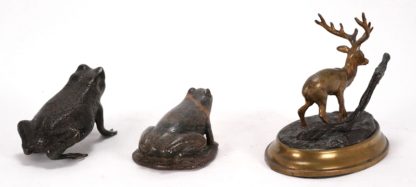 Wien um 1900. Ein kleiner Bronzehirsch, ein kleiner Bronzefrosch und ein Frosch aus Stein. Bronzefrosch unten monogrammiert ICD. Maximale Größe ca. 12,5 x 8,5 cm, Höhe ca. 11 cm. Teils berieben, teils best. (Nr. 100, 251, 242)