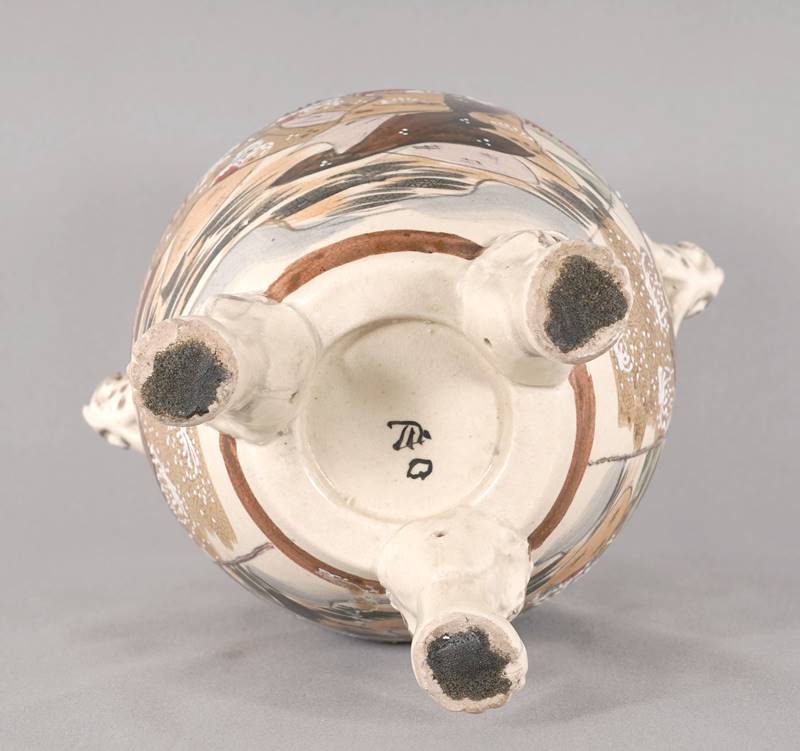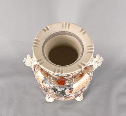 Japan 20. Jh. Keramik, polychrom gefasst. Schön gearbeitete Vase mit reichem Dekor. Amphorenförmiger Korpus auf drei Löwenbeinen, seitlich zwei Handhaben in Form von Drachen und mit ausladendem Kragen mit eingekerbtem Dekor. Auf der Außenwand mit Darstellungen von Samurais in einer Landschaft. Unter dem Boden Japanische Pinselmarke. Größe ca. 24 x 20 cm, Höhe ca. 32,5 cm. Gewicht ca. 2,3 kg. Teils minimal bestoßen. Zustand wie abgebildet, bitte selbst besichtigen.