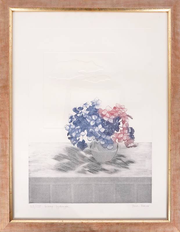 Beaver, Tessa 1932 Hampstead - 2018 Leamington Spa. Lacecap hydrangea. Farbradierung. Unten rechts nummeriert 113/125 und betitelt, unten links signiert. Druckgröße ca. 49 x 34,5 cm, hinter Glas gerahmt ca. 66 x 51 cm.