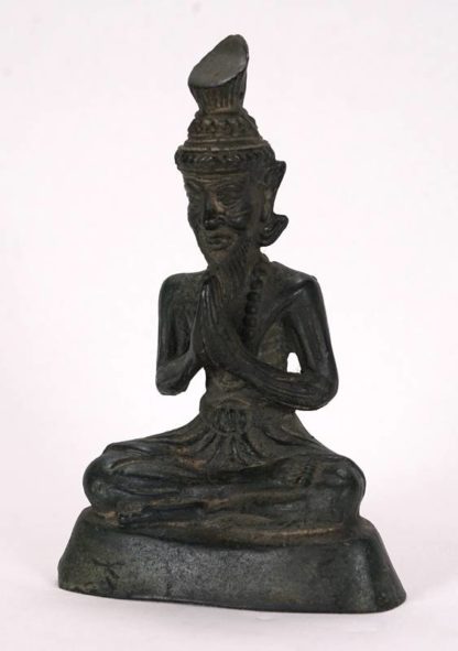 Thailand. Metallguss, gefüllt. Figur des betenden Einsiedler Lersi. Der Lersi-Pfad ist Teil einer Minderheitenreligion in Thailand, die aus der indischen Brahmanen- und der buddhistischen Tradition hervorgegangen ist. Anhänger glauben, durch Isolation, Meditation und Training übermenschliche Fähigkeiten zu entwickeln. Größe ca. 9,5 x 6 cm, Höhe ca. 14,5 cm. Gewicht ca. 420 Gramm. Altersbedingter Zustand.