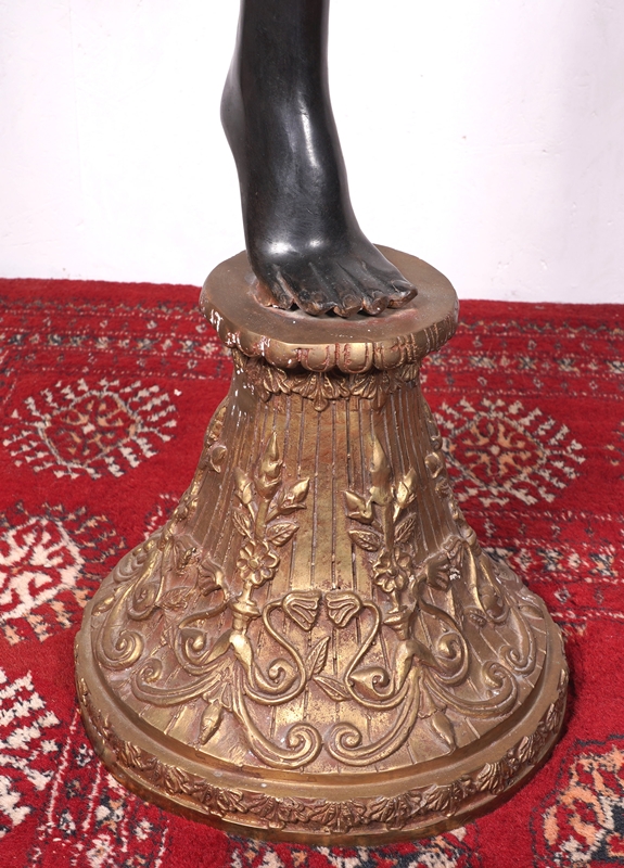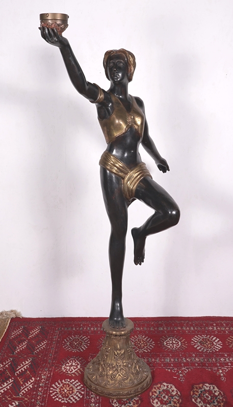 20. Jh. Bronze mit brauner und goldfarbener Patinierung. Knapp bekleidete Tänzerin, eine Schale mit der rechten Hand nach oben streckend. In der Schale eine nicht elektrifizierte Brennstelle. Höhe komplett ca. 134 cm, Gewicht ca. 19,1 Kilogramm.