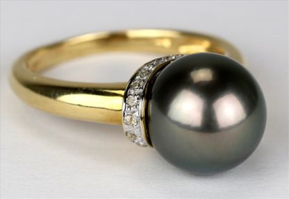 Deutsch 20. Jh. GG 585 punziert. Glatte Ringschiene mit gebogtem, mit Punktdiamanten besetztem Kopf und einer großen grauen Perle. Durchmesser Perle ca. 10 mm. Ringgröße ca. 54 bzw. 17 Gewicht ca. 4,7 Gramm.