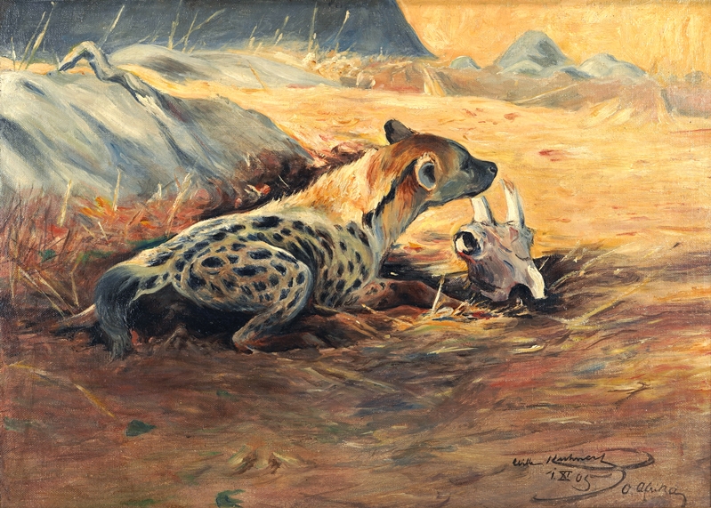 1865 Opole - 1926 Flims. Resting spotted hyena in a slightly impasto paint application and partly visible ductus. Oil on panel. Signed, dated 1905 and inscribed O. Afrika at lower right. Size approx. 37 x 50,5 cm, frame approx. 57 x 70 cm. Good condition. (No. 84)