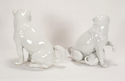 Mopsfamilie Porzellanmanufaktur Meissen, 20. Jh. Porzellan. Nach Modellen Johann Joachim Kaendlers von 1749. Rüde, Hündin und Welpe. Naturalistisch geformte Hunde mit Fellstruktur unter der Glasur. Unter dem Boden je unterglasurblaue Schwertermarke mit drei Schleifstrichen und Formnummern. Größe jeweils ca. 23,5 x 12,5 cm, Höhe ca. 25 cm. Guter Zustand.