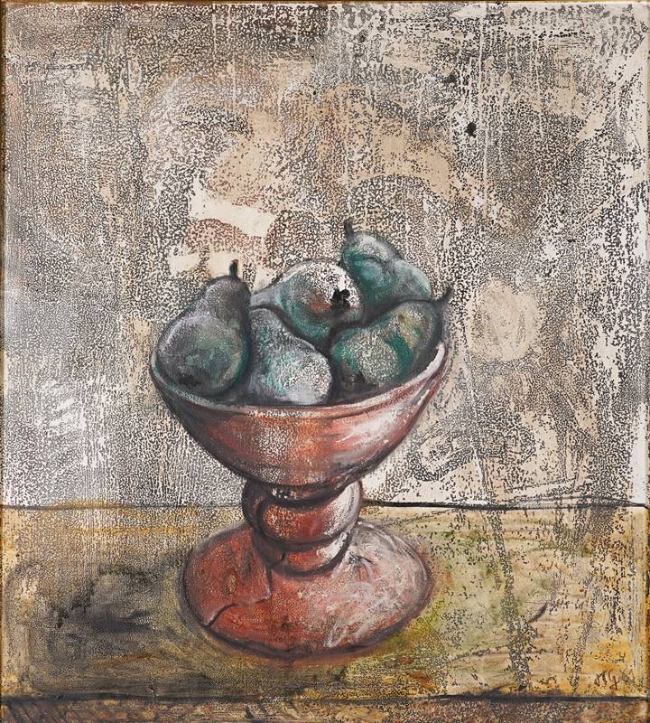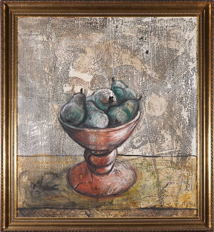 1934 Děčín - 2011 Karlsruhe. Stillleben mit Birnen, 1961. Öl auf Platte. Unten rechts monogrammiert und datiert 1961. Verso bezeichnet. Größe ca. 105 x 90 cm, Rahmen ca. 119 x 104 cm. Direkt beim Künstler erworben. Kein Versand, gerne empfehlen wir ihnen eine Spedition.