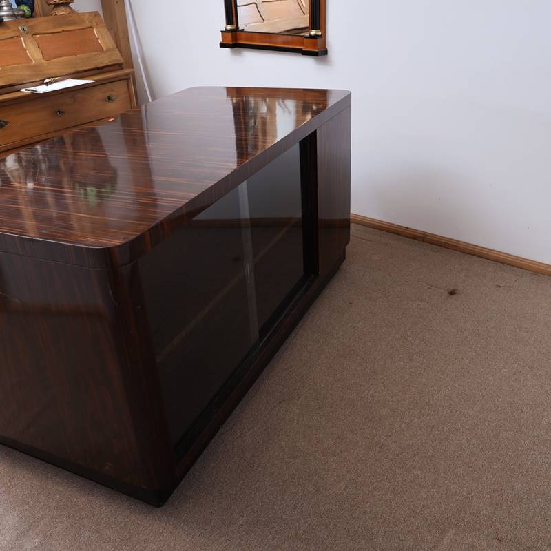 20. Jh. Holz furniert. Schreibtisch mit Stuhl (eventuell nicht zugehörig) und Beistelltisch. Schreibtisch mit abschließbarer Schublade und Seitenfächern. Rückseitig mit weiteren Fächern hinter Schiebeglas. Tischgröße ca. 160 x 78 cm, Höhe ca. 80 cm, Größe Beistelltisch ca. 90 x 90 cm, Höhe ca. 64,5 cm. Teils Kratzspuren auf der Tischplatte und an den Seiten. Schlüssel nicht vorhanden.