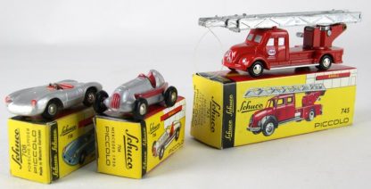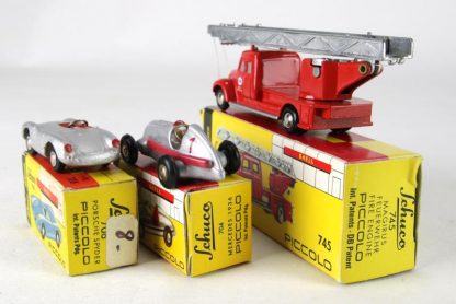Spielzeugautos: Magirus Feuerwehr (745), Mercedes 1936 (704) und Posche Spyder (708), inklusive Verpackung. Zustand wie abgebildet.