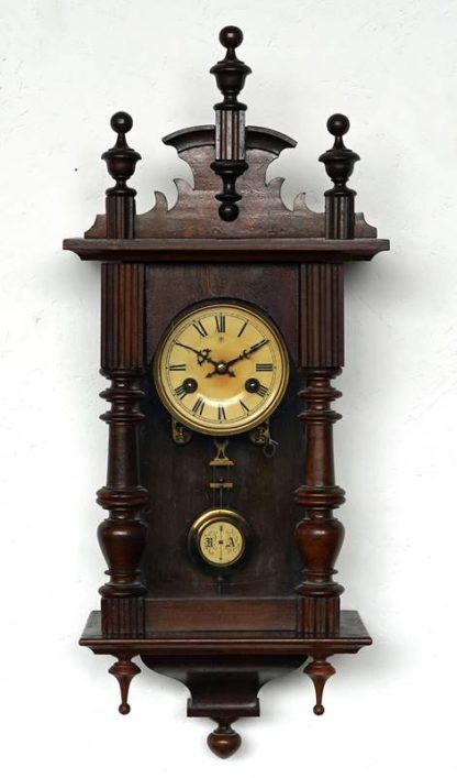Um 1900. Holzkorpus mit dreiseitiger Verglasung. Frontale Tür von zwei gedrechselten Säulen flankiert. Helles Ziffernblatt mit römischen Stundenzahlen und Herstellermarke Junghans unter der Zwölf. Messingräderwerk mit Pendel, Ankerhemmung und Schlüsselaufzug. Schlag zur vollen und halben Stunde. Auf dem Werk nochmals gemarkt und nummeriert A09 und 135. Größe ca. 28 x 17 cm, Höhe ca. 67 cm. Gehäuse teils bestoßen. Läuft an, Schlag löst aus. Schlüssel anbei.