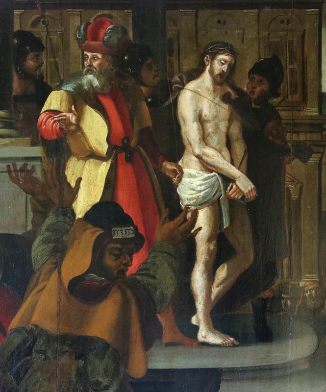 16./17. Jh. Ecce Homo. Vielfigurige Szene mit dem von Herodes auf einer Freitreppe vor dem Tempel von Jerusalem zur Schau gestellten Jesus in der Bildmitte. Der Leidensmann trägt bereits die Dornenkrone, steht aber noch aufrecht und in gewisser Weise selbstbewußt. Umringt werden die beiden von einigen Schergen. Der Hohepriester Kaiphas mit einer Kopfbinde mit hebräischen Buchstaben (wohl stilisiert für Judäa) zeigt auf Jesus und stachelt das von unten auf die Szene schauende Volk auf. Dahinter weitere Priester des Tempels. Die Szenerie lässt sich am ehesten in eine flämisch/holländische Architektur einordnen wie auch das gaffende und geifernde Volk nicht typisch morgenländisch sondern eher flämisch/holländisch anmutet. Hieronymus Bosch' Ecce Homo zeigt einen ähnlichen Bildaufbau, wiewohl das Gemälde allenfalls in dessen Tradition steht. Ähnliches Personal zeigt auch Jan Sanders van Hemessen in seiner Auffassung der Verspottung Christi aus dem Jahr 1644. Das Gemälde ist auf Holz gemalt und hinten aufwendig parkettiert. Oben links eine alte Inventarnummer auf Etikett. Größe ca. 100 x 74 cm, der Rahmen ca. 106 x 80 cm. Teils etwas Farbverlust an den Längsrissen.