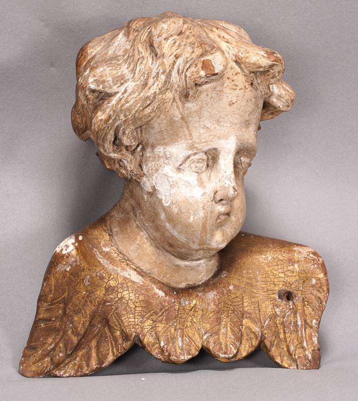 Wohl Süddeutsch 18. Jh. Holz, mit Kreidegrund und Resten alter Fassung. Größe ca. 25 x 18 cm, Höhe ca. 29 cm. Gewicht ca. 1,6 kg. Oben auf dem Scheitelpunkt ein Bohrloch. Verso am Hinterkopf mit Schraube zur Aufhängung. Teils leicht beschädigt, teils Risse im Holz, teils Abplatzungen der Fassung, ein Flügel ist durchbohrt.