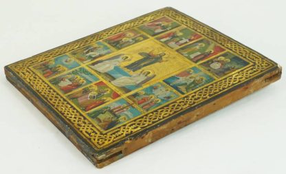 Ikone Russland. Vielfelder-Ikone mit Auferstehung Christi im zentralen Feld. Eitempera über Kreide auf Holz. Größe ca. 31,5 x 26,5 cm. Teils bestoßen, teils Farbverlust. Verso Holztafel beschädigt.