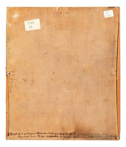 Ikone Russland 20. Jh. Geprägtes Metallblech, polychrom bedruckt und auf Holzplatte montiert. Heilige Theodosius von Tschernihiw. Verso bezeichnet. Größe ca. 31 x 26,5 cm. Teils berieben.