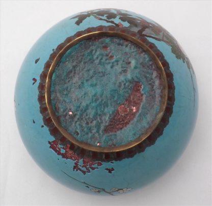 China Jiaqing Periode 18./19. Jh. Metallgefäß mit reicher Cloisonnémalerei mit Vögeln in Blütenbüschen. Unter dem Boden rotes Wachssiegel. Durchmesser ca. 29 cm, Höhe ca. 18 cm. Altersbedingter Zustand, teils stärker bestossen.