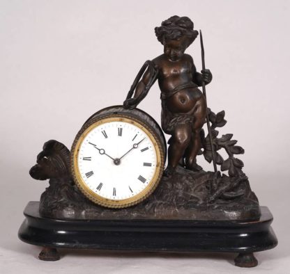 Frankreich 20 Jh. Metallene Uhrentrommel mit kleinem Amor mit Speer und Horn auf Holzpodest. Verglastes Ziffernblatt mit römischen Stundenzahlen. Rundes Messingplatinenwerk mit kurzem Pendel. Auf der Platine bezeichnet AF Brevete S.G.D.G. Kleine Zeichnung auf dem Deckel. Größe ca. 27 x 10 cm, Höhe ca. 25 cm. Läuft an. Schlüssel anbei.