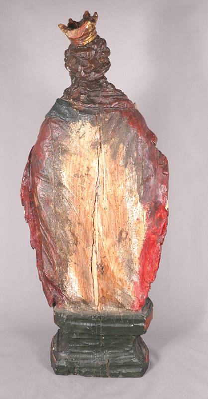 Wohl Spanien/Portugal um 1800. Holz geschnitzt, polychrom gefasst und goldstaffiert. Maria mit goldener Krone auf ihrem Haupt. Ihr Blick und ihre Hände weisen gen Himmel. Plastisch gearbeitete Standfigur mit polygonalem Sockel, dieser mit Kartusche. Größe ca. 30 x 24 cm, Höhe ca. 87 cm, Gewicht ca. 8,9 kg. Teils beschädigt, u.a. am Daumen. Zustand wie abgebildet, bitte selbst besichtigen.