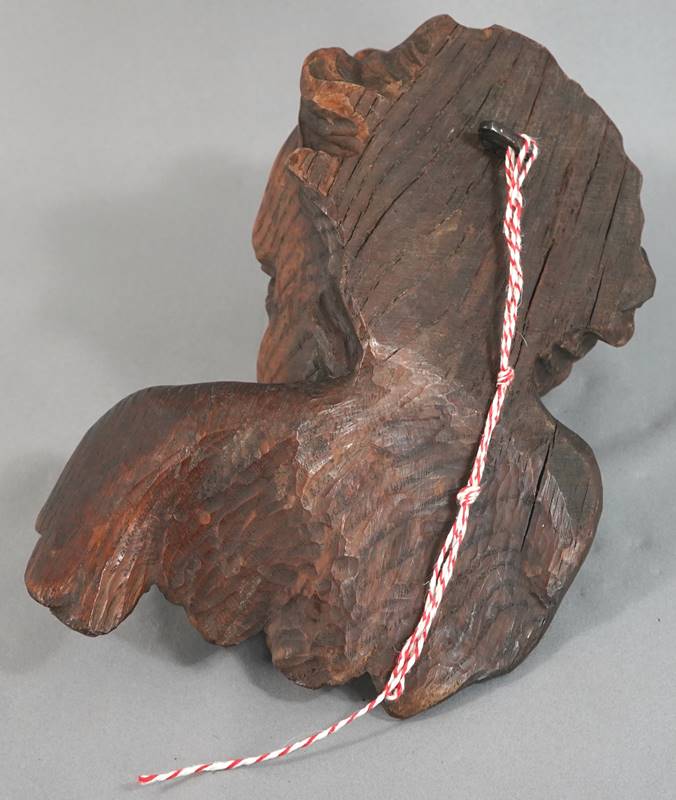 Barock Putto Süddeutsch, wohl spätere Ausführung. Holz, geschnitzt. Größe ca. 23 x 15 cm, Höhe ca. 32 cm. Gewicht ca. 2,6 kg. Verso ist ein alter Metallnagel zur Aufhängung montiert. Teils mit Spannungsrissen.