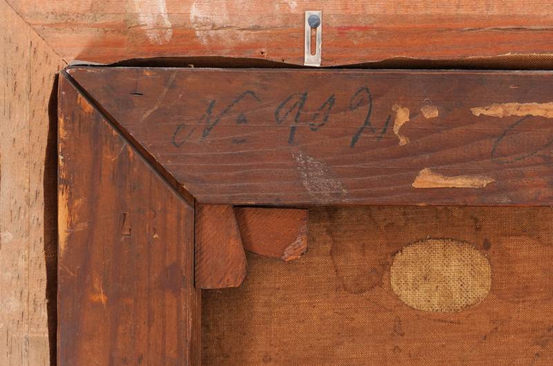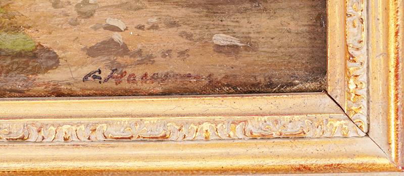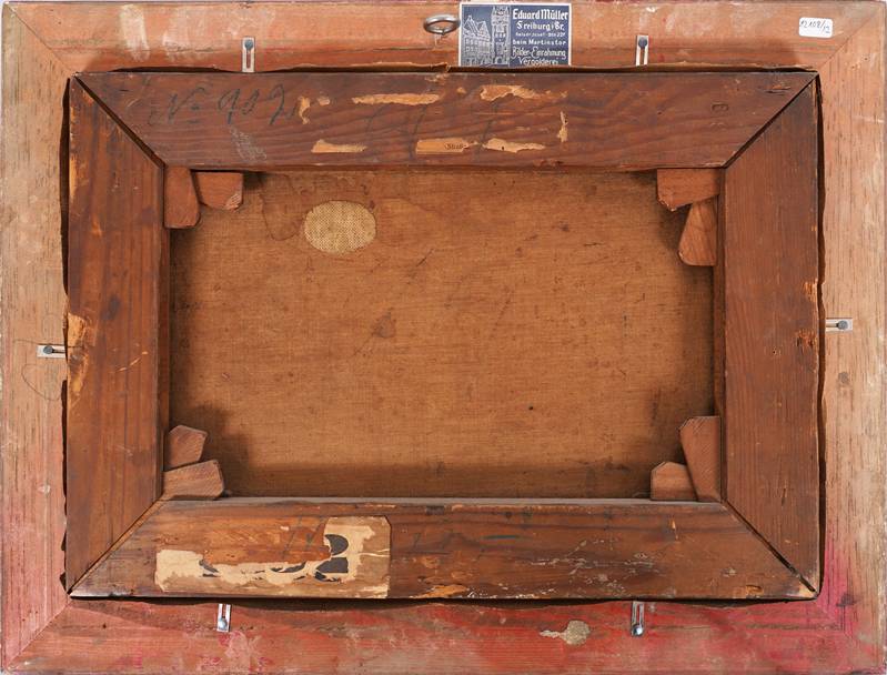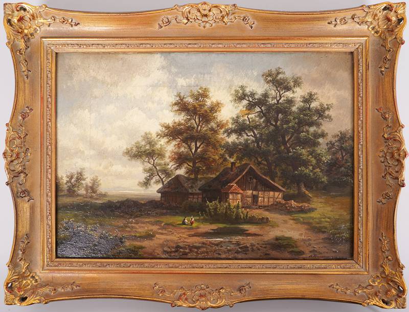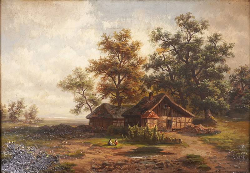 1827 Barbis - 1899 Hannover. Öl auf Leinwand. Ansicht eines Hofes in der Lüneburger Heide. Unten rechts signiert. Größe ca. 27 x 39 cm, Rahmen ca. 36,5 x 48 cm. Die Leinwand ist am oberen Rand restauriert/doubliert, oben rechts mit leichter Beschädigung, mit Craquelé, Druckstellen von hinten durch die Kante des Keilrahmens.