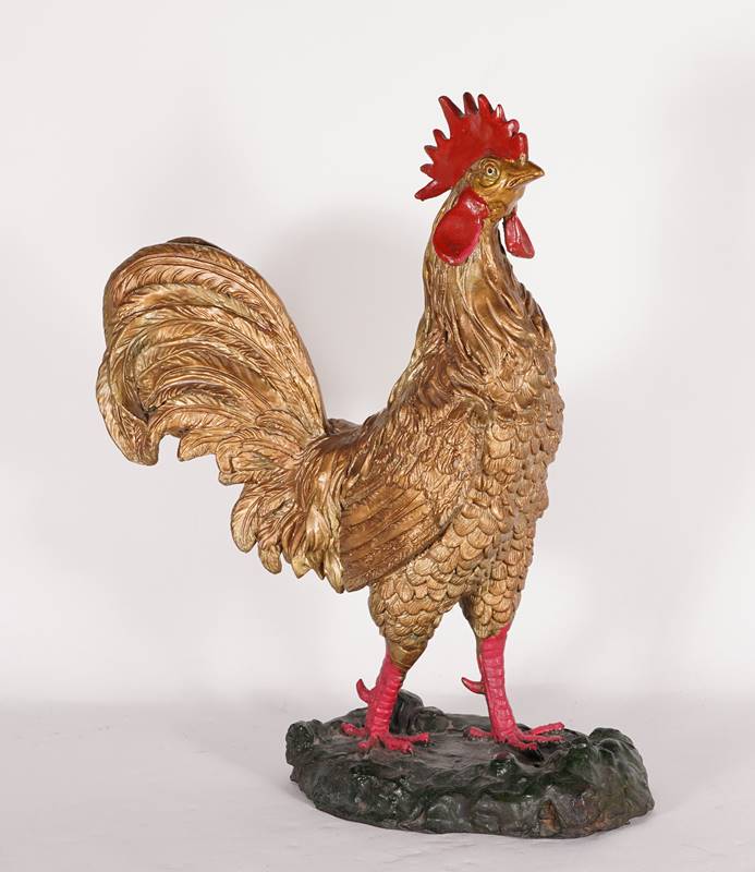 Wohl um 1900. Im Stil von Pierre-Jules Mêne (1810-1875). Vollplastischer Bronzeguss, polychrom gefasst. Schreitender Hahn mit goldfarbenem Gefieder auf naturalistischem Sockel. Größe ca. 34 x 16 cm, Höhe ca. 48 cm. Gewicht ca. 10 kg. Teils Farbverlust. Zustand wie abgebildet, bitte selbst besichtigen.