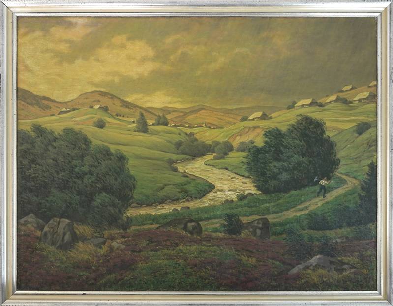 1877 Bretzingen - 1951 Freiburg i.Br. "Aufziehendes Gewitter (Bernau)". Öl auf Leinwand. Unten rechts signiert. Verso auf Keilrahmen nochmals signiert, betitelt, datiert 1928, bezeichnet mit Adresse des Künstlers, sowie von fremder Hand nummeriert 68 II und BK 837 II. Größe ca. 65,5 x 85,5 cm, Rahmen ca. 71 x 91 cm. Guter Gesamteindruck. Oberflächenverschmutzung, Bildträger leicht wellig, minimaler Farbverluste am äußeren Rand durch Spiel im Rahmen. Provenienz: Familie des Künstlers. Ausstellung: Hommage an Julius Heffner, den Schwarzwaldmaler aus dem badischen Frankenland, Hardheim, Erfatal Museum, 2010, Kat.Nr. 75. Literatur: Museumsverein Erfatal e.V. (Hrsg.), Hommage an Julius Heffner, den Schwarzwaldmaler aus dem badischen Frankenland (1877 - 1951), Eine Retrospektive über sein Lebenswerk, Hardheim 2010, S. 30, Kat.Nr. 75. Werkverzeichnis: Heffner, S. 168, Nr. 275.