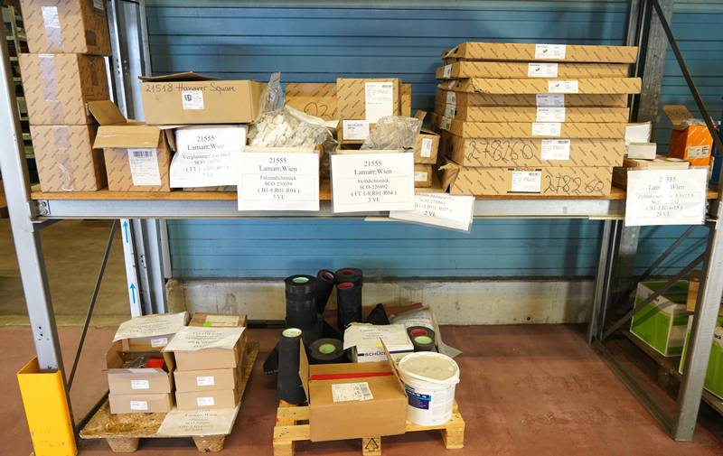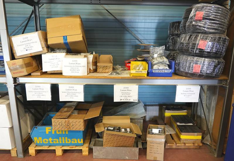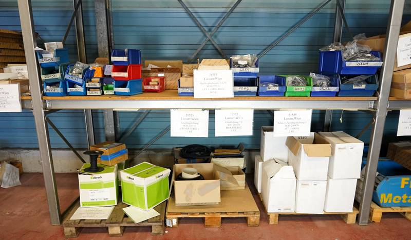 Regalinhalt in drei Feldern auf verschiedenen Ebenen. Diverse Schrauben, Dichtungen, Profile, Isolierrohr u.v.m.