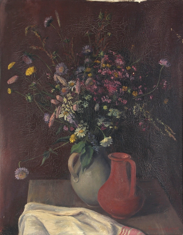 Rumpelhardt, Ludwig 1911 Heidelberg - 2010 Rheinstetten. Blumenstillleben mit filigranen Frühlingsblumen. Öl auf Leinwand. Unten rechts signiert und datiert 1948. Größe ca. 70 x 55 cm, Rahmen ca. 81 x 65 cm. Craquelé, oben ist die Leinwand leicht lose.
