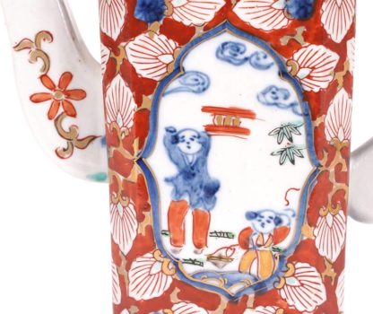 Teekanne Wohl Japan 20. Jh. Porzellan, polychrom gefasst und goldstaffiert. Quadratische Kanne mit abgeflachten Ecken. Dekor im Imari Stil mit je einer Vignette pro Seite. Boden unglasiert. Größe ca. 18 x 8 cm, Höhe ca. 19 cm. Teils berieben.