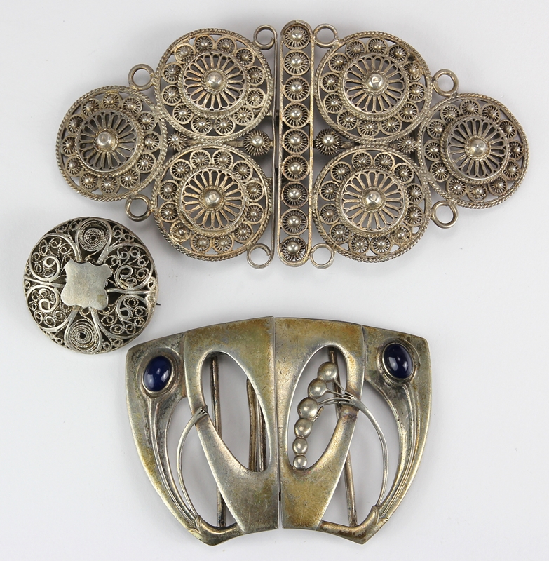 Eine Silbergürtelschnalle (ca. 35 Gramm), eine versilbert mit zwei Farbsteinen. Dazu eine Brosche. Auf der Rückseite gepunzt 830 S. Altersbedingter guter Zustand.