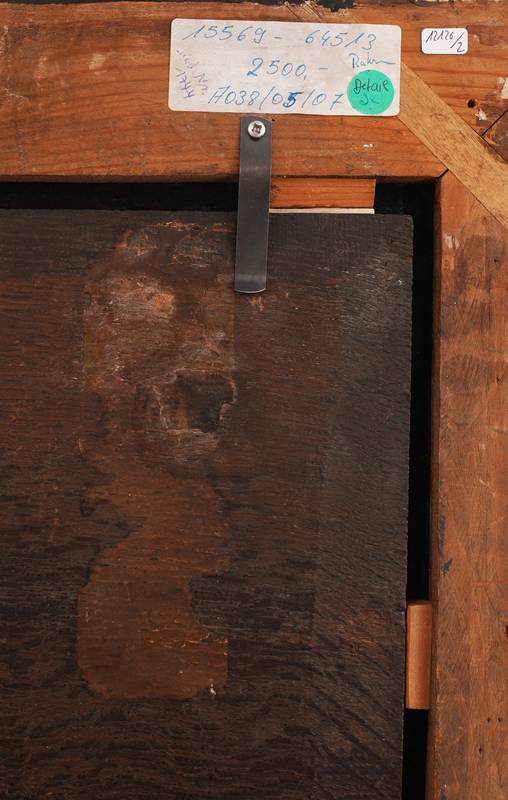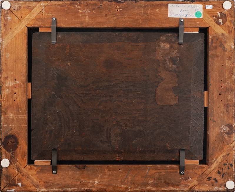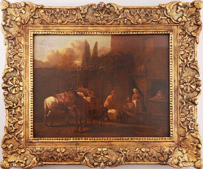 Jardin, Karel du 1622 Amsterdam - 1678 Venedig, nach. Spätere Kopie nach "Maultiertreiber im Gasthaus", welches sich heute im Rijks-Museum Amsterdam befindet. Öl auf Holz. Verso mit handgeschriebenem Inventar- oder Auktionsetikett auf dem Rahmen, auf dem Bildträger schwer leserliches Etikett mit Stempel (?). Größe ca. 33,5 x 45 cm, Rahmen ca. 50 x 61 cm. Altrestaurierter Zustand mit minimalem Farbverlust.