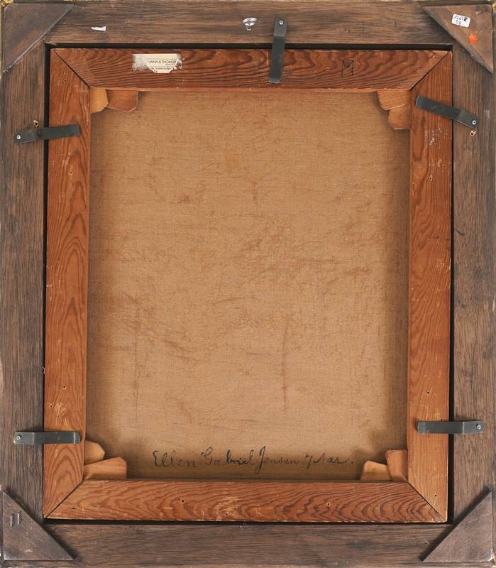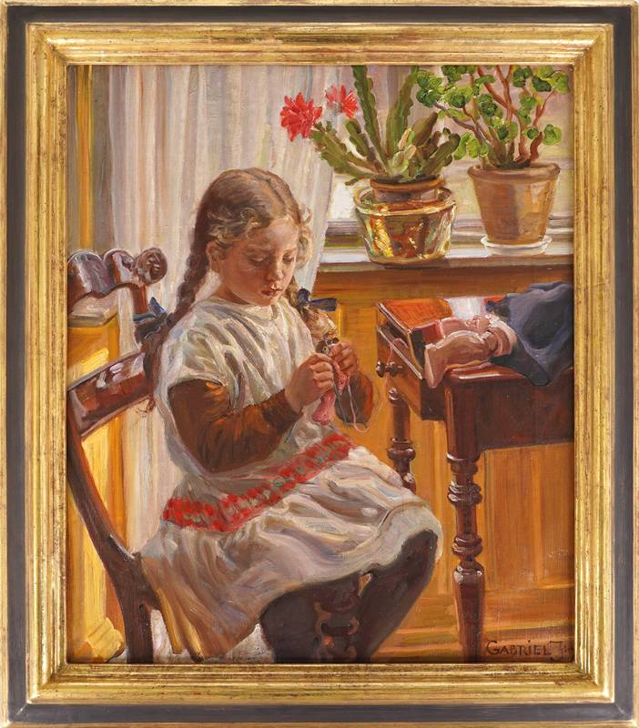 1862 Lyngby - 1930 Kopenhagen. Die Tochter des Künstlers, Ellen, beim Stricken. Öl auf Leinwand. Unten rechts signiert und datiert 1917, verso betitelt. Größe ca. 47,5 x 41 cm, Rahmen ca. 58 x 51 cm. Jensen studierte 1887-1890 an der Kopenhagener Akademie, seit 1891 war er zeitlebens in den Charlottenborger Frühjahrsausstellungen vertreten, 1900 beschickte er auch die Pariser Weltausstellung. Jensens Oeuvre umfasst sowohl Genremotive als auch Landschaften und mit sicherer Hand gemalte Porträts mit subtiler, individueller Charakterisierung der Gesichtszüge.