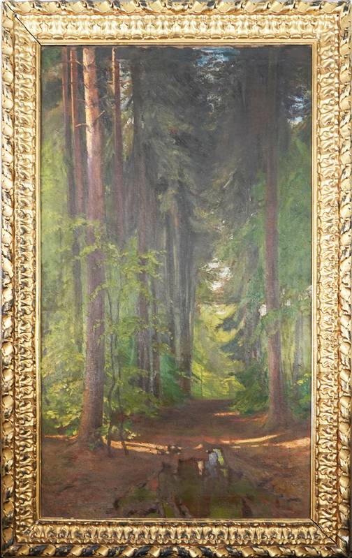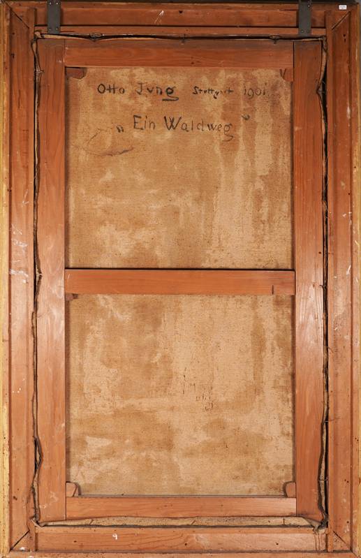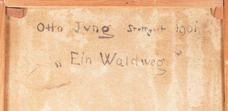 1867 Ostdorf - 1935 Stuttgart. "Ein Waldweg". Öl auf Leinwand. Verso signiert, betitelt, bezeichnet "Stuttgart" und datiert 1901. Größe ca. 114 x 67 cm, Rahmen ca. 135 x 86 cm. Kein Versand möglich, wir empfehlen gerne eine Spedition.