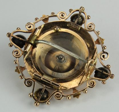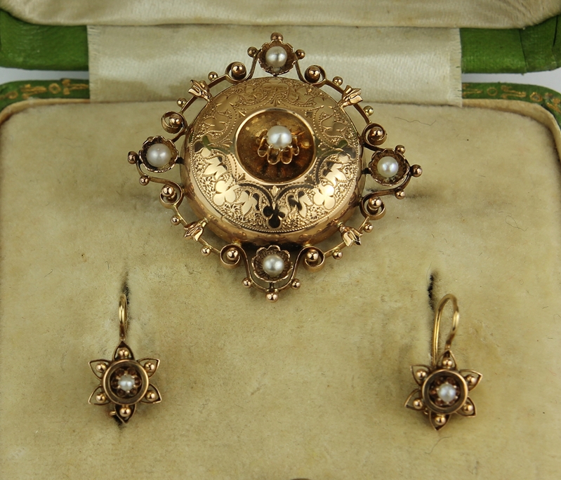 Jugendstilensemble Österreich um 1910. Jh. GG 585 punziert und Meistermarke. Brosche und ein Paar Ohrringe mit Saatperlenbesatz. Größe Brosche 28 x 25 mm, Gewicht zusammen ca. 5,8 Gramm. In originaler Schatulle Rudolf Starke, Juwelier in Wien.